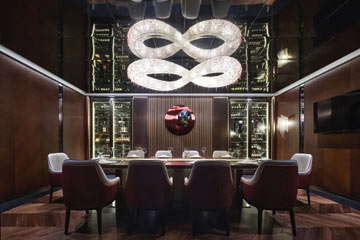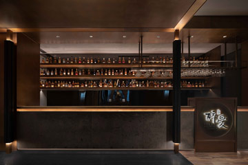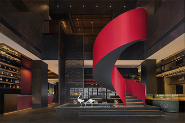 山居荣府中餐厅设计以富春江白鹭为题,借富春江两岸初秋景色为依托,从店面的LOGO形象到软装陈设,都由此统一展开。进入门厅区域,是一副白鹭水戏图,旁边旋转而上的中国红楼梯,是整个空间一大亮点。逶迤蜿蜒的造型,连接多元空间的同时,也是冷静素雅的直线条里穿插的超级印象符号。两侧是吧台与明厨分厅而立。右手边通透简明的明厨,模糊......