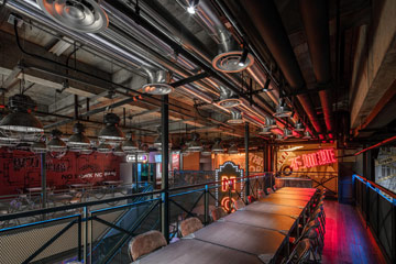 本案小龙虾工厂店作为落户于商业综合体内的餐饮项目,设计师首先考虑到的是商综对周边辐射带来的大量青年人群。结合夜宵的时间特征,以及消费群体的社会属性,餐饮装修设计公司以“下班后”作为切入点,利用项目的高度优势,将工业工厂引入到空间中,一方面,设计希望在高端商区里给人以氛围的亲近感,另一方面,以空间的钢架结构虚写工厂情景,......